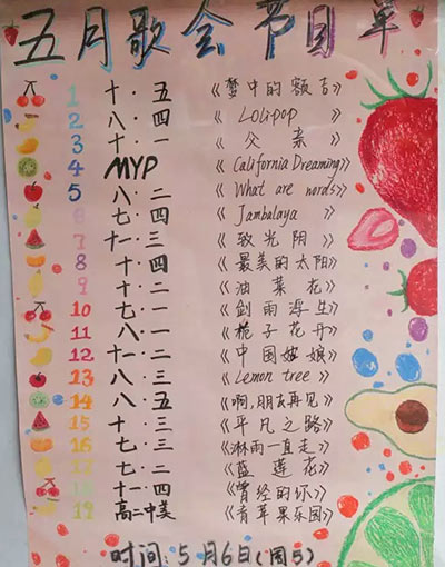 邁著不變的步伐向我們走來。她輕舞在云端,那里微風(fēng)細(xì)雨、飛燕呢喃;她徜徉于山間,那里幽蘭吐蕊、空谷含煙;她娉婷在陌上,那里芳草鮮美、落英繽紛;她駐足于校園,這里書聲瑯瑯、春色滿園。2016年5月6日,我們舉辦了以“盛夏的果實(shí)”為主題的五月歌會,歌曲要求為青春勵志、積極向上。此次歌會的準(zhǔn)備工作從3月底一直持續(xù)到了5月初。在學(xué)校和宣傳部精心制作的海報(bào)的大力宣傳下,全校師生積極準(zhǔn)備。