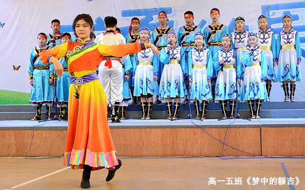 高一五班首個出場,他們以一首《夢中的額吉》讓我們感受到了母愛的無私和偉大,也讓我們感受到了蒙語和舞蹈的魅力;