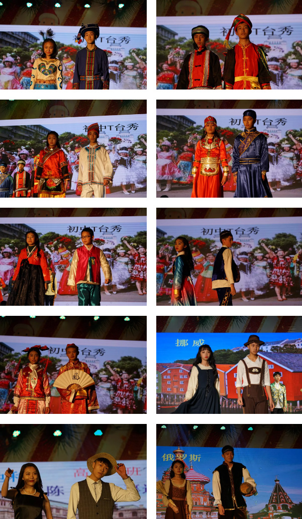 本次各班T臺秀的主題為“文化”,初中各班展示的是我國少數(shù)民族文化,高中各班展示的是歐美國家文化。