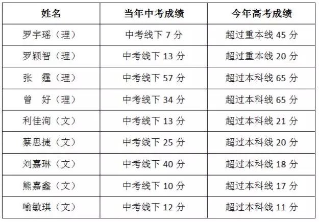 我校當年中考重點線上20分的學生在本次高考中重本上線率高達100%(而成都名校學生當年入口普遍在中考重點線上50分以上,但今年高考的重本率也只有80-90%);當年中考重點線上學生本科上線率同樣達到100%。還有不少當年中考未上重點線的學生,在本次高考中分數也遠超本科線甚至重本線。現列舉部分學生中、高考分數對比表: