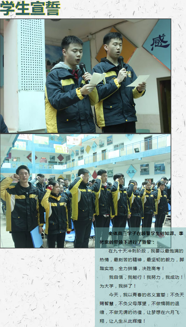 “滴水穿石戰高考歲月應無悔,乘風破浪展雄才折桂當有時!”年輕的我們面臨的是又一次為希望而沖刺的機會,又一次為六月高翔而努力的誘惑。惶惑也罷,疲憊也罷,心中涌動的總是不服輸的勇氣,渴望有搏擊擊長空的瀟灑,渴望有化蝶翩飛的絢爛!相信自己,拼搏九十日,我們一定能成功!