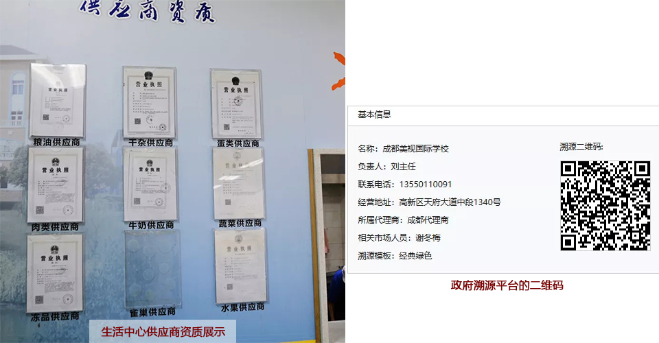 所有的供貨(原材料),可以在政府“溯源平臺”上查到相關的源頭。每一個環節都有政府部門監管。生活中心也公示有溯源平臺的二維碼,每天食用的肉類、菜蔬,都可以掃一掃查找到相應的供應環節和供應商,學生、老師、家長都可以了解其來源。