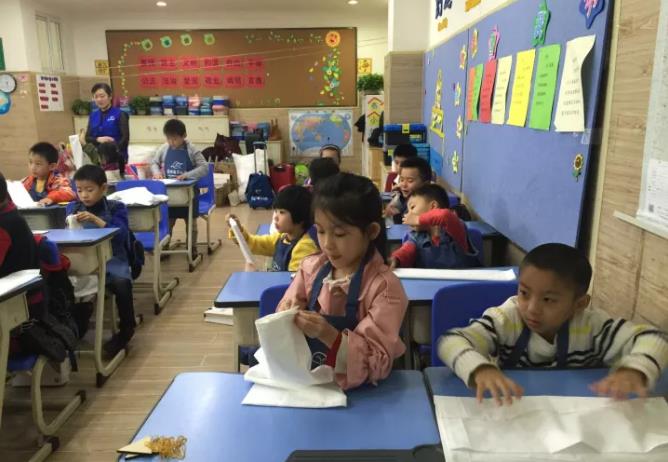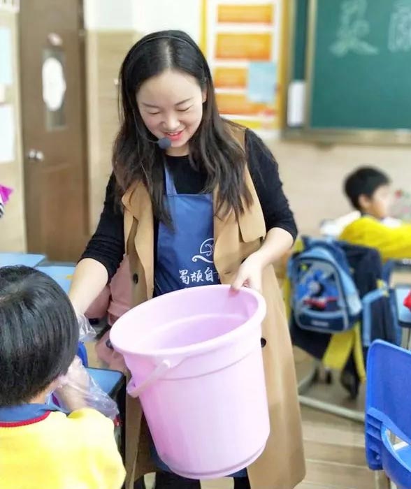 成都美視學校中國部·小學 二年級二班溫柔親切的班主任扈老師幫忙孩子們分發染色后的作品