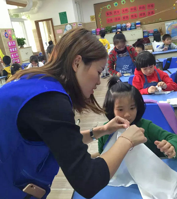 四川玉和祥珠寶旗下自貢市扎染工藝有限公司總經理曹東瓊女士為孩子示范扎纈技法