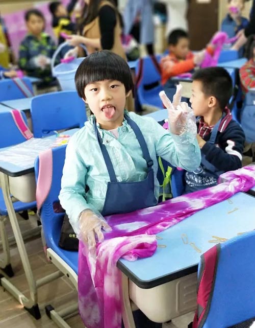 自由、創意、多變是創意扎染的特點,因其獨特魅力深受孩子們喜愛。四川玉和祥珠寶旗下自貢市扎染工藝有限公司帶著專業的扎染老師,為美視學校中國部·小學二年級二班孩子們現場講述、演繹扎染的工藝之美,讓孩子們不僅了解了自貢扎染的歷史起源、生活中的扎染應用,更為孩子們悉心講解扎染的制作流程的工藝,并指導孩子們親自動手,體驗自貢扎染濃濃的魅力。