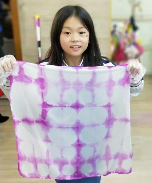 孩子們的扎染作品新鮮出爐了,一張張洋溢著自豪的笑容,歡樂的討論聲此起彼伏,孩子們紛紛表示要將自己扎染的絲巾、抱枕送給最愛的長輩們。通過本次自貢扎染DIY體驗活動,孩子們加深了對民族文化的興趣及了解,還制作出了獨一無二的“扎染”藝術作品。快樂有意義的童年也正應該如此這般!