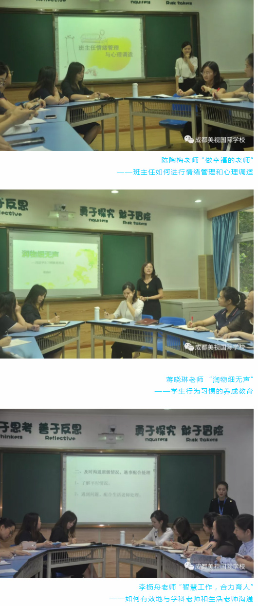 今天的班主任會非常特別,三位非常有經(jīng)驗(yàn)的班主任分別就“學(xué)生的行為養(yǎng)成,和學(xué)科、生活老師的溝通與互助,自我情緒的有效管理”三方面,為我們做了分享,引發(fā)了我們的思考。