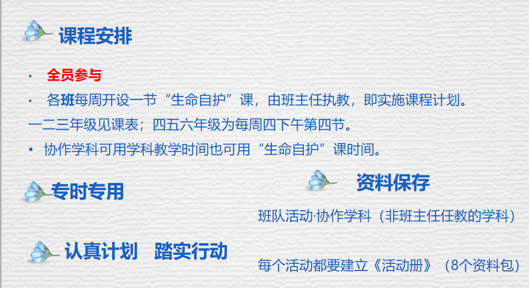 最后古雪老師宣布了課題成果——《小學生自護習慣及突發事件應對寶典》與《身心健康手冊》落實的人員分工,以及“生命自護課程”的相關安排。