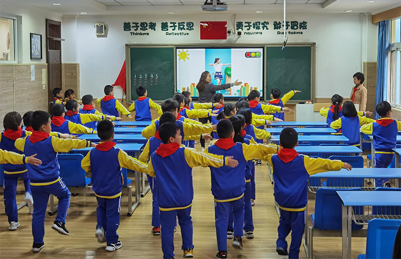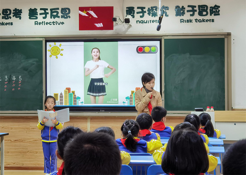主持人出場,向隊員們提問:過馬路時,有哪些注意事項;我們應遵守哪些交通禮儀。各小隊將做好的“交通標志”小報在臺上進行匯報展示。最有趣的環節是,主持人帶領全體隊員做了一次交通知識的競賽。該節中隊課特意邀請音樂學科作為協作學科進行教學,將交通法規編成兒歌,讓學生一邊唱跳,一邊將交通法規記在心里。