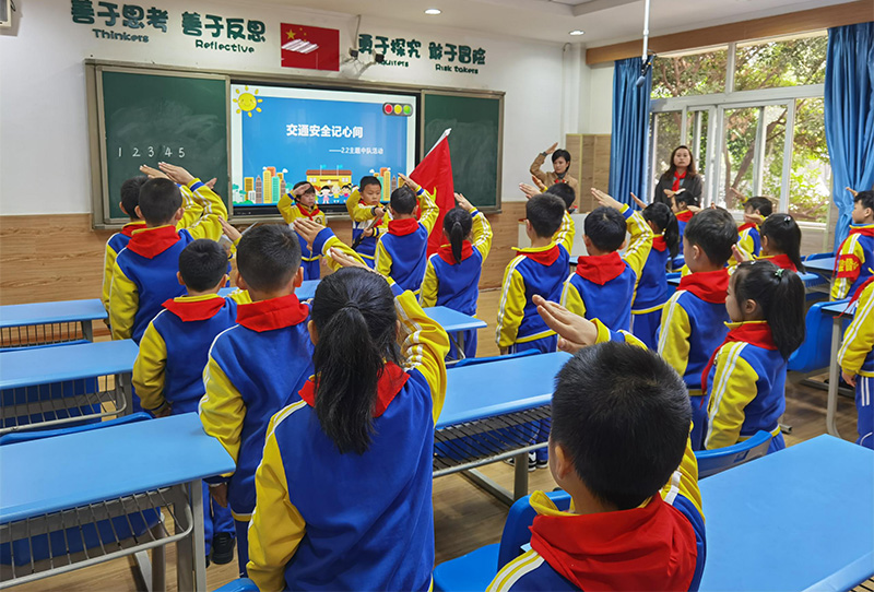 培訓會的第一項流程,由二2中隊呈現了一堂以“交通安全記心間”為主題的少先隊生命自護課:按照“三二三方案模式”,先進行“三報程序”(小隊長報人數給中隊長,中隊長報人數給中隊輔導員),再出旗、唱隊歌。