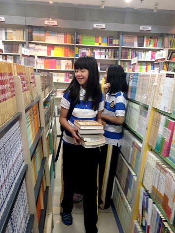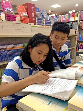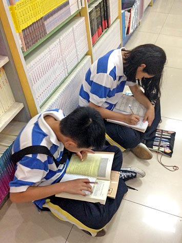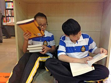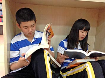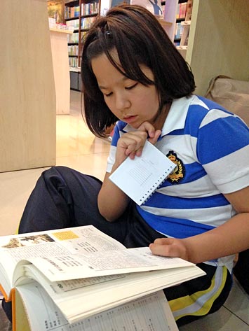 一來到書城,興奮的同學們立刻分組行動,各自找到跟讀書報告主題相關的區域,仔細翻閱書籍,查找相關資料,并將有用的信息抄寫在早已準備好的筆記本上。