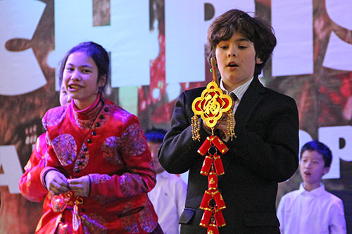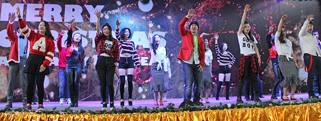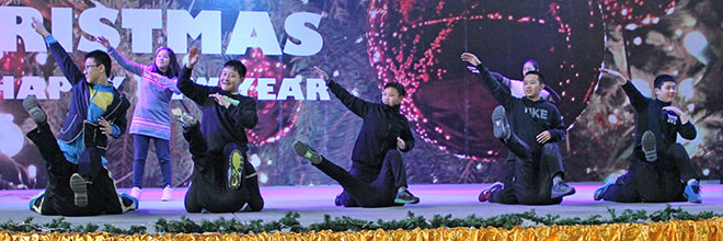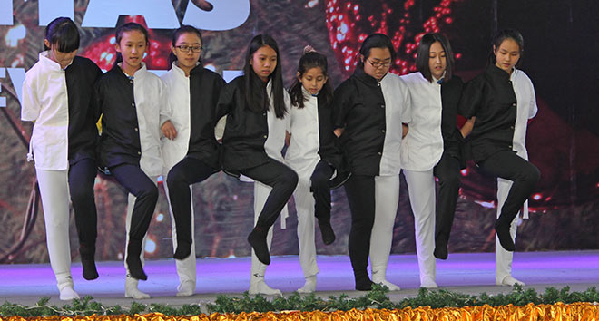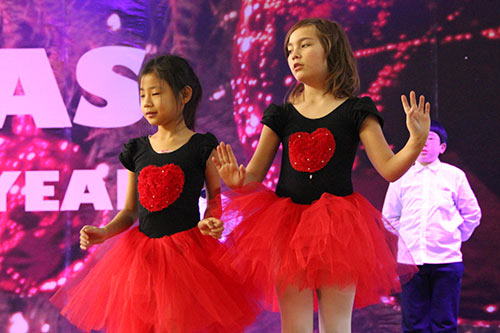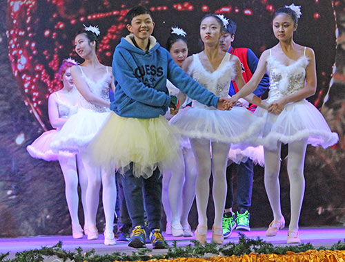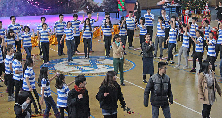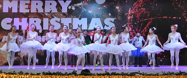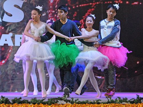 各個年級的同學們隨后給大家帶來了歡快的舞蹈和優美的歌聲,把圣誕新年慶典推向了一個又一個的高潮。尤其是九年級同學帶來的舞蹈“Swan”,看著平時嫻靜甜美的女孩子們跳著優雅的芭蕾,讓人移不開眼睛;而平時英俊帥氣的男孩子們穿上天鵝裙跳舞的樣子,又讓大家忍俊不禁。