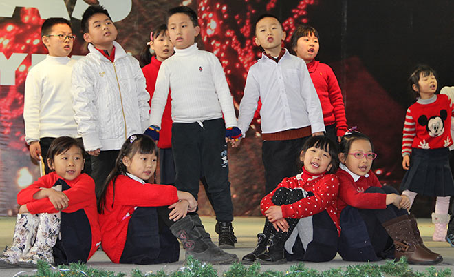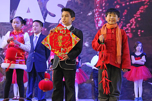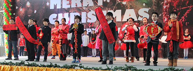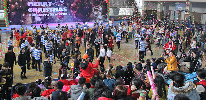 冬日難得一見的暖陽映照著充滿活力的校園,濃濃的圣誕新年氛圍悄悄地藏在校門口高大的圣誕樹上,藏在圣誕老公公和藹的笑容中,藏在國際部每位老師與孩子的心里。12月19日的學校體育館里歡聲笑語,紅色綠色的圣誕裝飾物隨處可見。孩子們同家長、老師一道歡聚一堂,慶祝這個歡樂的節日。