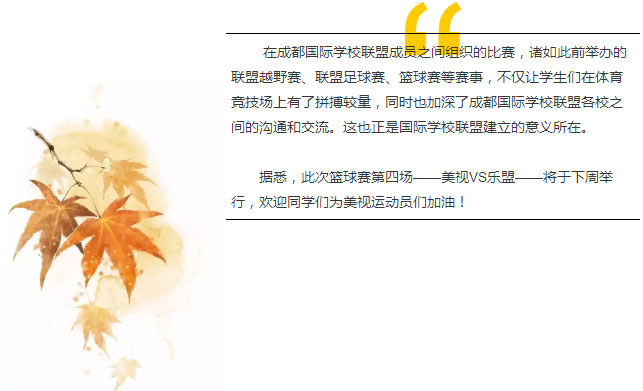 最近,美視體育館有新面孔頻繁出入。每到星期二下午,總能聽到館內頻頻傳出陣陣吶喊加油聲。 原來,是成都國際學校聯盟的籃球聯賽在美視開戰了。 成都國際學校聯盟是成都的國際學校共同組成的一個大家庭。成員學校之間每年都會舉行各種有趣的聯賽。 此次聯盟籃球聯賽由美視主辦,參與的學校有美視、CDIS、QSI、樂盟和孔裔國際學校。 這一次,美視作為主場,迎戰了去年的冠軍CDIS。