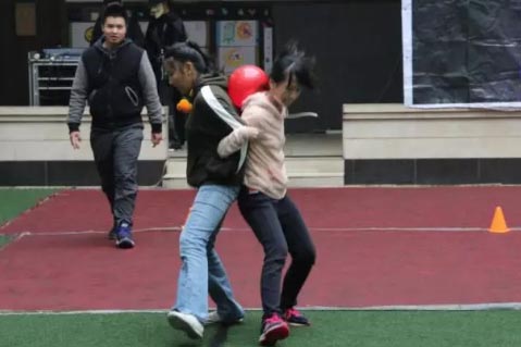 雙人帶球接力比賽,最先完成的小組能得到萬圣節的趣味糖果。雨中的奮力拼搏有了糖果的激勵變得更加精彩。