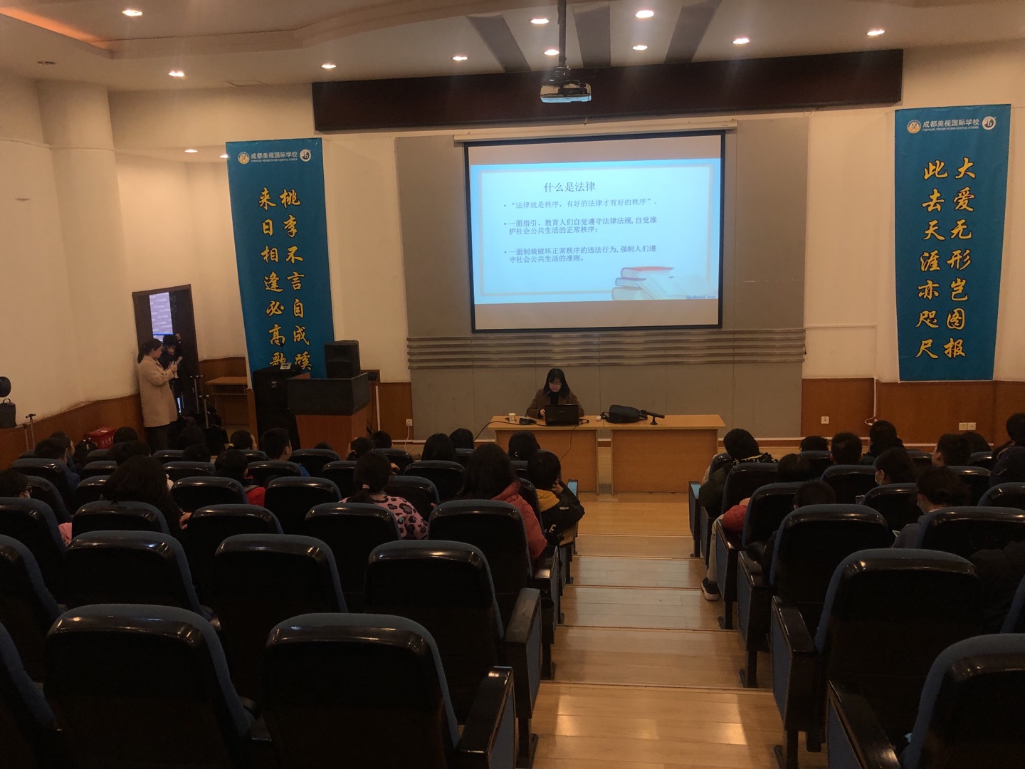 12月3號下午IB部“百家講壇”系列講座在學校學術廳和禮堂分別舉行了兩次講座,其中6-7年級學生在學術報告廳參加了由四川志村律師事務所的劉曉娟律師主講的法律講座。