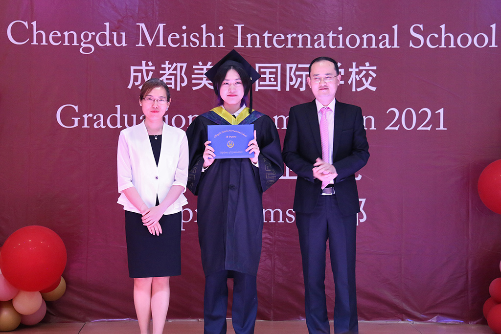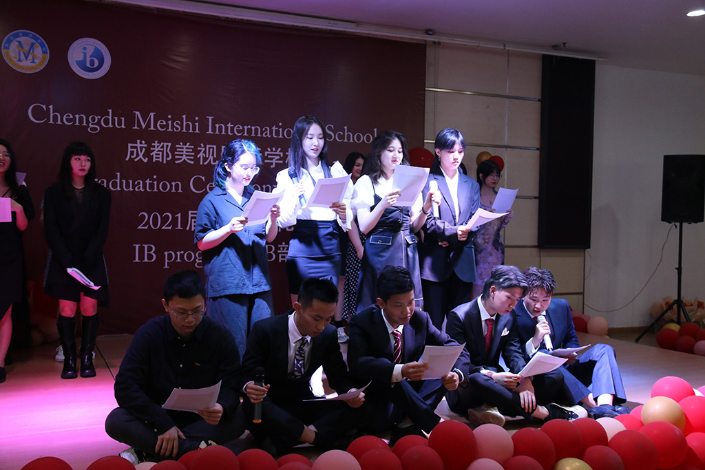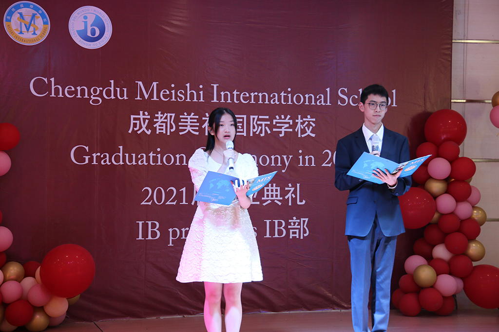 典禮開始,12年級班主任昌老師帶領所有畢業生入場,接下來IB部劉校長發言,她回顧了畢業生的美視學習生涯,用不同顏色形容了2021年,是畢業們戰勝困難取得優異成績的金色,是代表畢業生多元化的彩虹色,是代表師生互相關懷的炙熱的紅色,是代表思念與祝福的藍色。劉校長還提出了對畢業生的囑托,希望大家時刻在人生中準備好planB,有備無患;堅守本心,不忘初心;保持批判性思考,并且永遠保持做人的善良和正直,剛柔并濟面對這個世界。