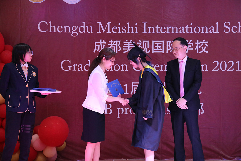 接下來IB部劉校長與DP協調員Mr.Lorry為畢業生頒發證書。劉校長代表IB部為獲得斯坦福offer的畢業生Sera頒發紀念品。