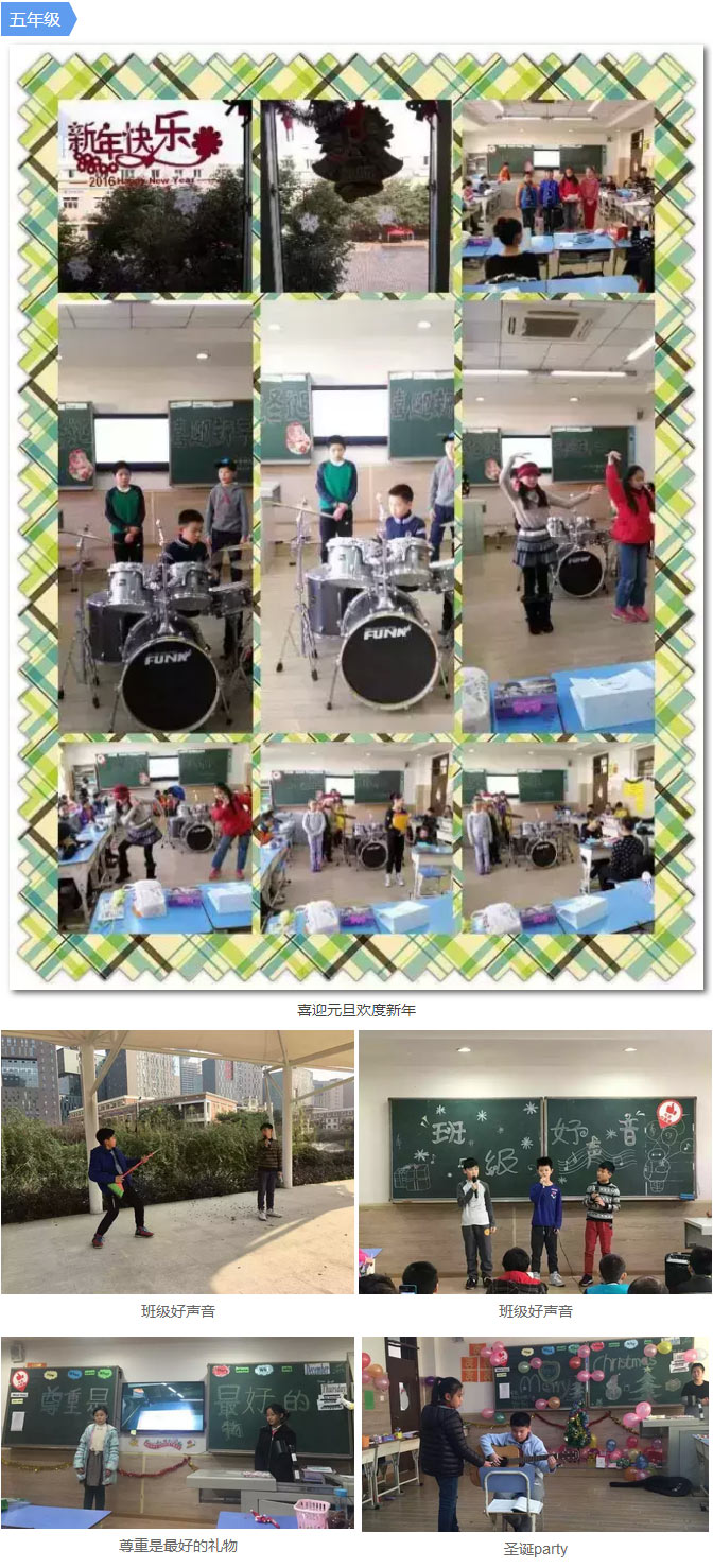 五年級的孩子們,在老師和同學們的合作下,進行著為期一周的國際交流周英語展示,他們變著花樣給大家說英文,英語故事,英文寓言,英文歌,還有老師們的集體亮相,讓孩子們體驗著國際文化的樂趣。五年級的孩子也自行組織參與圣誕慶祝會,他們自編自演,自彈自唱,還請來爸爸媽媽一起狂歡,這些感動我們的畫面都是時間給予我們的成長記憶。
