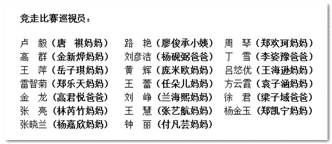 (竟走巡視員為一名老師和一名家長負責一個點,主要的是監督各比賽隊伍是否犯規,要求只能走不能跑,如發現有跑的現象,就及時提示,并作好記錄,發現一次跑比賽成績上加5秒,三次以上將取消比賽成績,直接評為第六名)