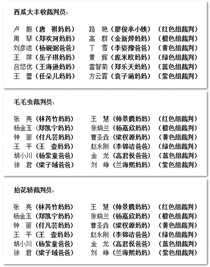 (西瓜大豐收、毛毛蟲、抬花轎的裁判員兩人(家長志愿者和老師)一組負責一個組,主要是清點比賽隊伍的人數,負責提示比賽中不要犯規)“逼著”大朋友們參與運動,綠色健康生活從自己做起!因此,讓我們期待大小朋友們的默契與合作吧!(后續報道將在我們的“回味篇”中呈現。)