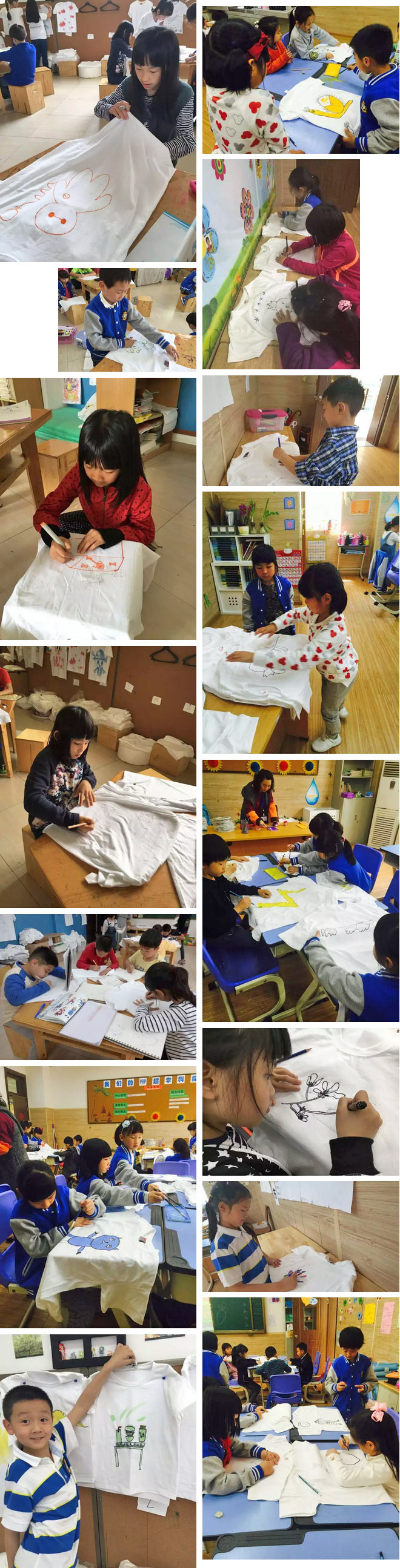 項目班級的孩子似乎已經習慣了一件事情,那就是自己的事情要有自己的主意或者觀點。瞧!一件普通的白色T恤,加上各自的創意,讓藝術的表達呈現在自己的“戰衣”上,這是多么令人興奮,多么值得驕傲的事情啊!