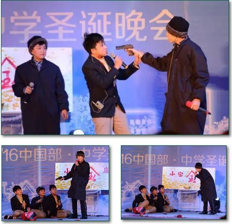 金正陽、李文博、李相庭、趙逸陽、周澤珺、唐嘉凱等同學表演的小品《搶劫》就為我們展示了一出鬧劇。