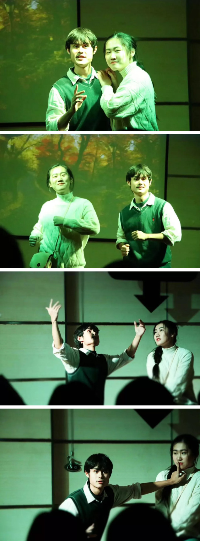 這是一部由美國編劇John Guare寫的荒誕故事,由11年級的Joshua Favin和10年級的Sera Wang演出,Joshua 將男生古怪的幽默感淋漓精致的展現出來,Sera將女生從最初的的孤獨,到陷入愛情的喜悅,從發現自己介入他人愛情時的茫然糾結,到最后堅定赴死的勇氣都恰到好處的表演出來,加上兩位演員一氣呵成的大段大段流利的英文對白,我們的眼前呈現了一場完美的西方話劇表演。