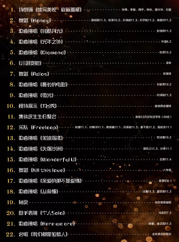 經過了一個多月的籌備,2020新年晚會暨首屆校園十佳歌手大賽于12月25日21:30圓滿結束,每一次大型活動過后感覺整個人都神清氣爽了!活動中催場組賽場飛奔,保證每個節目演員按時到場;話筒組左上右下,及時給歌手遞上話筒;道具組跑前跑后,把沉重復雜的道具搬上舞臺;引領組頗具風度,認真細致地做著引領和接待工作;紀檢組東奔西走,積極維持活動現場秩序;攝影組能抬能扛,用心記錄著每一個精彩的瞬間;媒體組手腦并用,有序播放著每一個節目素材;道具管理組兢兢業業,認真看管著所有物資;兼具顏值和才華的主持人隊伍認真組織著每一個節目;更有帥氣十足的音樂社帶來的精彩演繹。