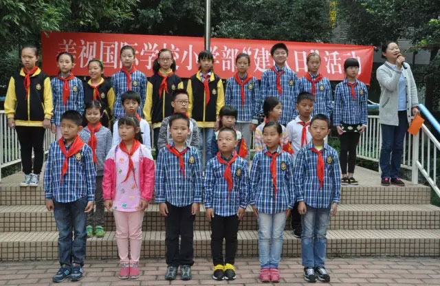 緊接著,四年級的哥哥姐姐們,莊嚴地為我們的新隊員系上了紅領巾,并且在郭老師的示范下宣誓、呼號。這一神圣而莊嚴的時刻相信已牢牢地記在了每一個少先隊員的心中。“我是中國少年先鋒隊隊員……準備著,為共產主義事業而奮斗!時刻準備著……”這誓言不僅僅是語言,更是行動。所有的少先隊員們也同在美視“PYP”理念的指引下努力做著團結友愛、互幫互助,舉止文明、行為規范,有責任人、有原則、有愛心,積極探究、勇于嘗試,知識淵博、全面發展的美視學子!