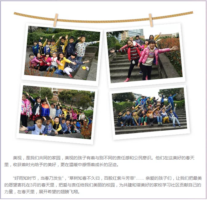 他們以小組為單位,探究學(xué)習(xí),了解春天的時(shí)節(jié)、花草種類,在美麗的校園和春風(fēng)的陪伴下,放飛著一盞盞帶著夢(mèng)想起飛的風(fēng)箏,盡情享受著萬(wàn)物復(fù)蘇的春情和生機(jī)勃勃的春天。