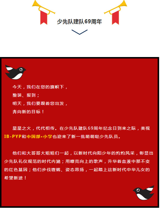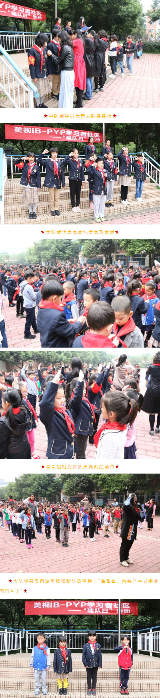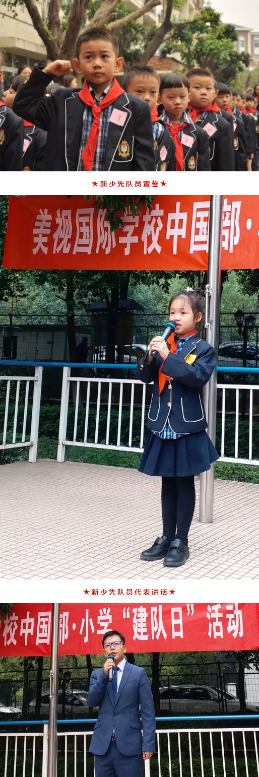 本次主題為“隊歌嘹亮,隊旗飄揚”的建隊日活動是我校踐行IB的全納理念邁出的重要一步,包容接納所有孩子成為光榮的少先隊員。在美視,你們都是“紅領(lǐng)巾”!