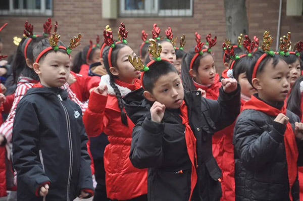一、二年級(jí)的乖乖們頭戴鹿角,歡快地演唱了