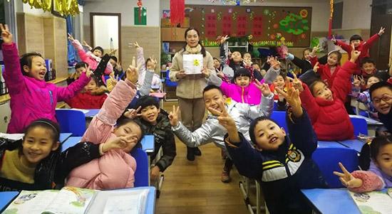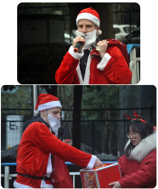 最后的環(huán)節(jié)更是令人激動(dòng)不已:由外教Mr. Spencer裝扮的Santa Claus會(huì)從全校19個(gè)班里,每次抽取出2--3個(gè)幸運(yùn)班級(jí),并派出“圣誕小精靈們”為這些幸運(yùn)班級(jí)的孩子們送去甜蜜的糖果。小小的糖果,吃在嘴里,一直甜到了心坎兒里。