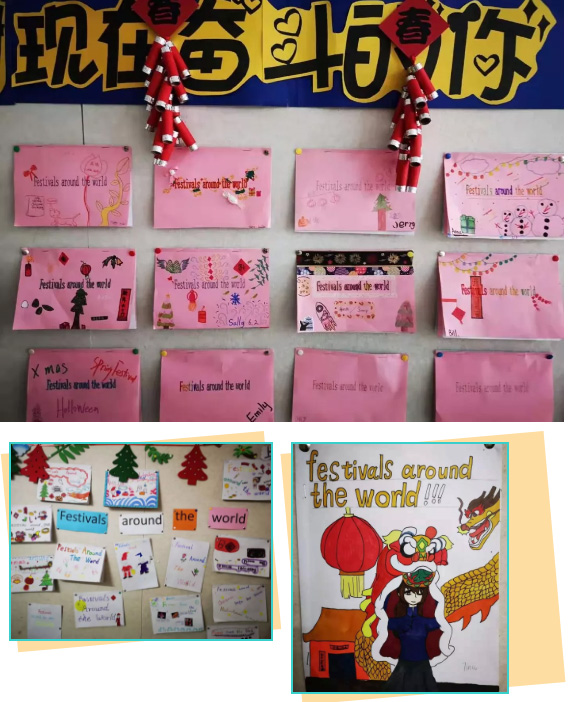 再來(lái)看看三樓的樓道外墻。六年級(jí)的孩子聚焦國(guó)際文化與國(guó)際理解,對(duì)比中西方各種節(jié)日活動(dòng)。既了解咱們中國(guó)的傳統(tǒng)節(jié)日和習(xí)俗,也關(guān)注其他國(guó)家的特色節(jié)日,并寫出自己的思考與見解。