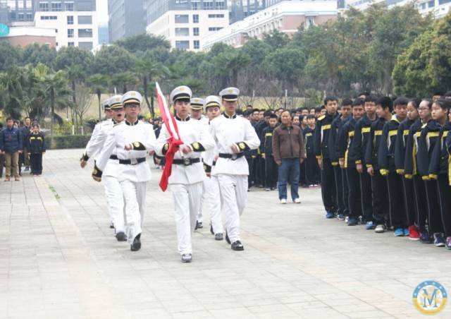 一身潔白的禮服,矯健的步伐,手持鮮紅的國旗,紅與白交相輝印,國旗隊隊員們腳踏莊嚴的節奏,迎風而來。