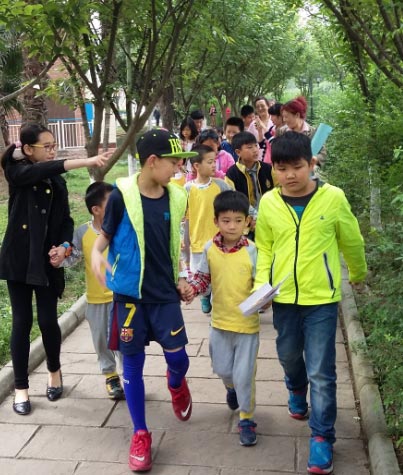 大手牽著小手漫步于美麗的人工湖畔,綠樹成蔭,滿庭芳華。行路之余,哥哥姐姐們還不忘向小客人們介紹湖邊優美的景色。