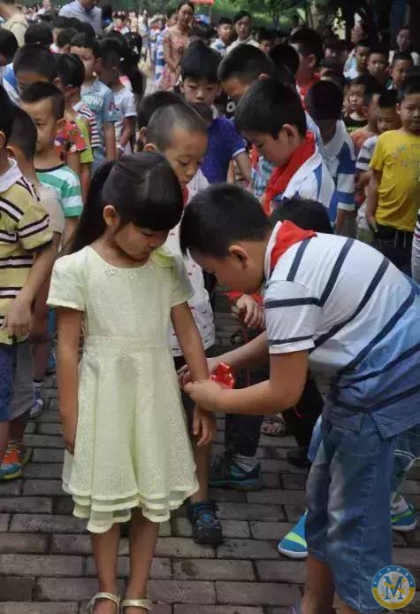 緊接著,四年級的哥哥、姐姐們為新到美視的一年級弟弟、妹妹們戴上了那朵鮮艷的小紅花。