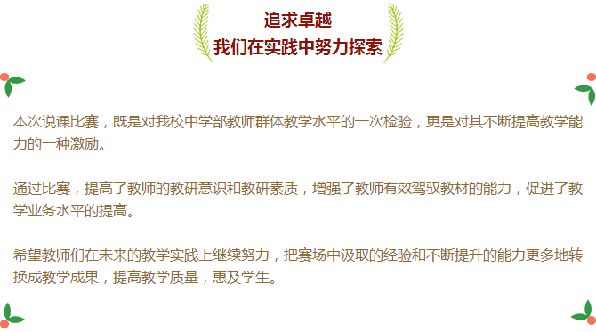 為了促進中學部教師群體快速成長,培養教師把握教材、駕馭教材的能力,通過以“說”促“教”的方法,進而達到提高課堂教學水平的目標。中學部教學研討月與12月2日和9日分別在初中學段和高中學段開展了說課比賽。