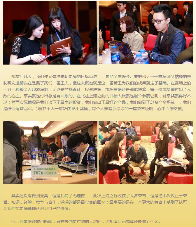 回想整個商賽:比賽中運行繁忙的節奏,危機結束會心的微笑,領獎臺屬于我們的榮耀。一切,都讓我們在心中回蕩著不可名狀的感情。一路上,大悲大喜,大起大落,希望中處處是危機,絕望中處處有希望,幸運就在于,經歷其中的不是你,不是我,而是我們。公司,從開始到成長,見證的不僅僅是比賽的運行,更是每個人的用心與耕耘。而其中熔鑄的也是彼此的友情。彼此見證著彼此的成長,彼此推動著彼此向前。