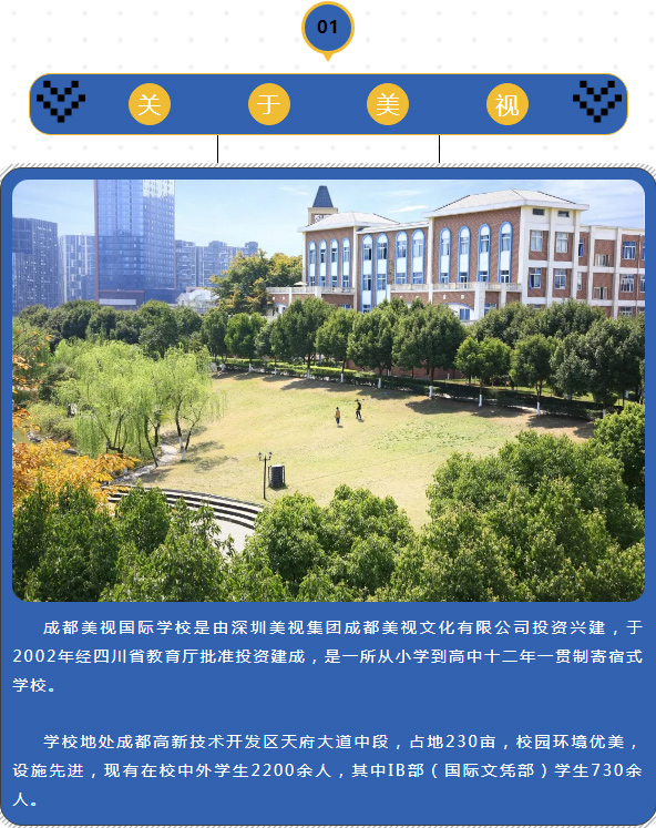 成都美視師一學校前身為成都美視學校,是成都市首批老牌民辦學校。學校于2002年經四川省教育廳批準投資建成,是一所從幼兒園至高中全學段的國家課程和融合教育雙軌制、K12、高品質、寄宿式的私立學校。辦學以來,學校一直堅持多元化教育,融合創(chuàng)新,取得了令人矚目的辦學成績,獲得了IB(國際文憑)授權,并通過了美國中部院校聯(lián)盟(MSA-CESS)、美國私立學校委員會(NCPAS)及認證國際(Ai)等世界領先教育機構的資格認證。同時,我們也獲得了美國大學理事會(College Board)授權開設AP課程,成為真正享有世界認可的國際學校。