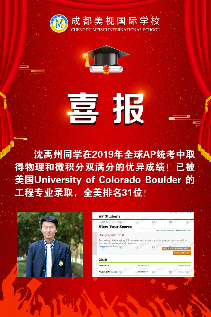 喜報(bào):中美英才班沈禹州同學(xué)在全球AP統(tǒng)考中取得物理和微積分雙滿分的優(yōu)異成績(jī)!