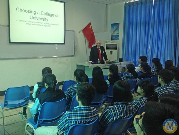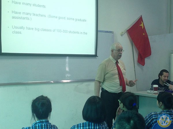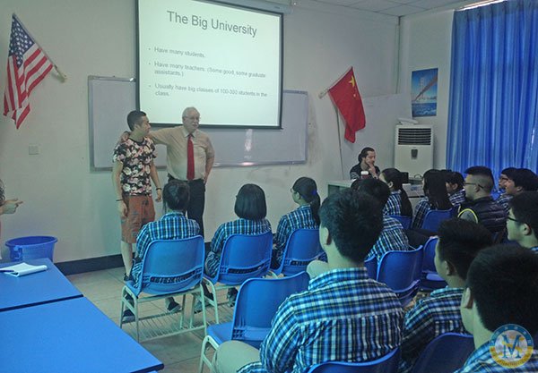 2015年5月29日上午,來自美國普利茅斯州立大學商學院的院長Boggess 來到美視中美英才班,在選擇大學的方面給高一高二同學們分享了一些見解與看法,同時也邀請了兩位在PSU學習的校友為同學們介紹普利茅斯州立大學。