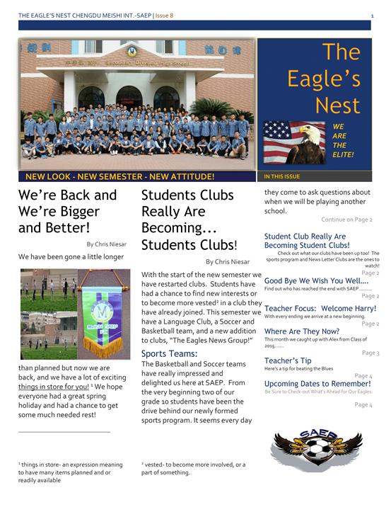 隨著新學(xué)期的開始,我們的俱樂部活動也相繼開展起來。同學(xué)們可以借此機(jī)會發(fā)現(xiàn)新的興趣并且也能更好的投入到所參加的俱樂部活動中去。這學(xué)期,我們成立了語言俱樂部,足球俱樂部,籃球俱樂部以及鷹之巢新聞社。