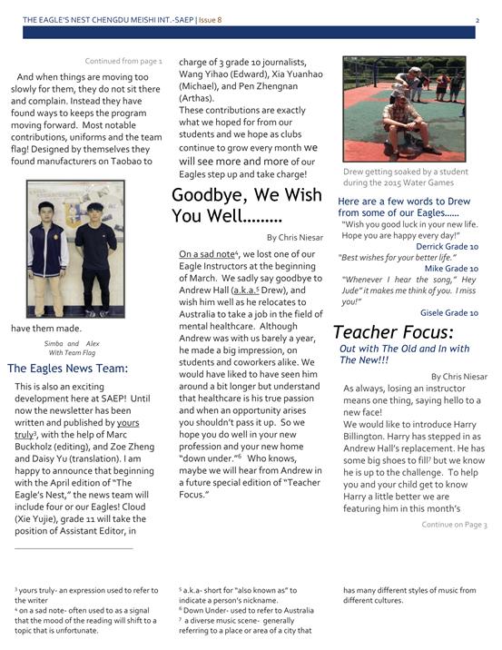 這又是一件令人興奮的事! 很高興地向大家宣布從四月版的鷹之巢月報(bào)開始,將會由四位同學(xué)共同參與月報(bào)的編輯工作。他們分別是來自高二年級的Cloud(謝鈺杰)和來自高一的Edward(王一灝),Michael(夏源毫)和Arthas(裴正楠)三位同學(xué)。Cloud擔(dān)任助理編輯,其他三位同學(xué)分別擔(dān)任記者。