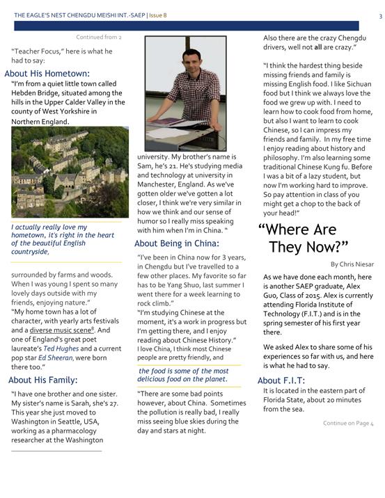 Alex: 回想高中,老師們給予了我很多的幫助。他們友善且睿智,現(xiàn)在也是如此。大量的英語課程為我現(xiàn)在習(xí)慣每天用英語交流奠定了堅(jiān)實(shí)的基礎(chǔ)。雖然我的口音還存在一些問題,但我相信會變得更好的。