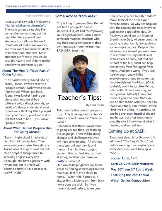 Alex: 多與他人交流。不要只與中國學(xué)生交流,這對于提高你的英語能力是不利的。據(jù)我了解,有些國際生在網(wǎng)上買自己國家語言版本的教材。相信我,這絕對是一個不明智的做法。