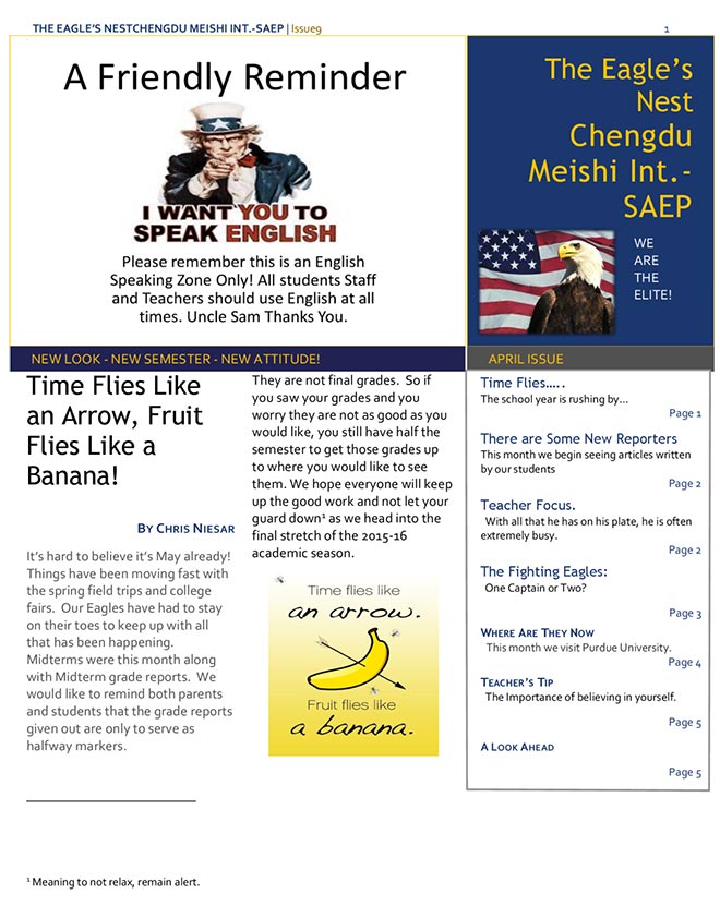2016年4月已經向我們說再見!在過去的一個月,不論是踏春還是大學教育展都給同學們留下了深刻的印象。我們的《鷹之巢》也會跟隨大家的腳步來清晰的記錄這一切。期中考試已經結束,成績單也都發到了孩子們的手中,但是不論家長還是孩子們請謹記,這只是孩子們漫漫求學路上的一個小小的篇章,不論成績好壞,請邁開步子,繼續向前走!希望在2015-2016學年的期末,每個孩子都有更加輝煌的成就!