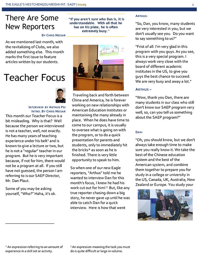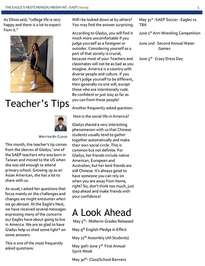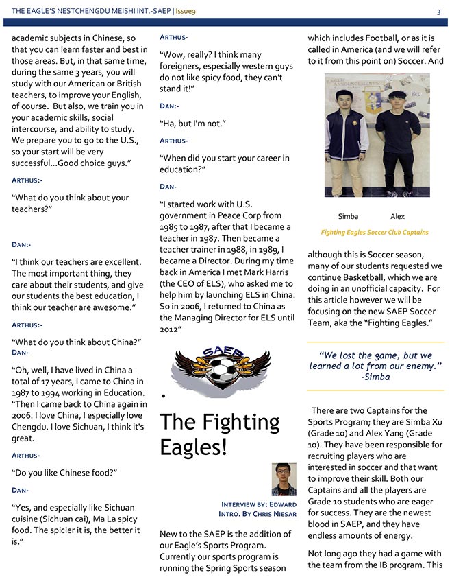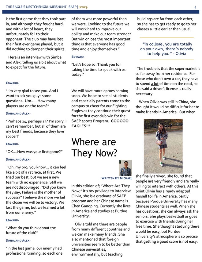導語:本期鷹之巢月報與大家正式見面啦!為您帶來中美英才班最新時事、趣聞、雜匯。這里有足球俱樂部成長之路;中美英才班往屆畢業生異國求學趣事分享;英才班主任Dan Plaut先生暢談人生經歷;英才班外教Gladys為你的國外求學生活支招。精彩內容,盡在本期鷹之巢月報!