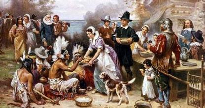 1962年9月,“五月花號”輪船載著102名清教徒及其家屬離開英國駛向北美大陸,經(jīng)過兩個多月的艱苦航行,在馬薩諸塞的普利茅斯登陸上岸,從此定居下來。第一個冬天,由于食物不足、天氣寒冷、傳染病肆虐和過度勞累,這批清教徒一下子死去了一半以上。第二年春天,當(dāng)?shù)赜〉诎膊柯淝蹰L馬薩索德帶領(lǐng)心地善良的印第安人,給了清教徒谷物種子,并教他們打獵、種植莊稼、捕魚等。在印第安人的幫助下,清教徒們當(dāng)年獲得了大豐收。首任總督威廉•布萊德福為此建議設(shè)立一個節(jié)日,慶祝豐收,感謝上帝的恩賜。同時,還想借此節(jié)日加強(qiáng)白人與印第安人的和睦關(guān)系。1621年11月下旬的星期四,清教徒們和馬薩索德帶來的90名印第安人歡聚一堂,慶祝美國歷史上第一個感恩節(jié)。男性清教徒外出打獵、捕捉火雞,女人們則在家里用玉米、南瓜、紅薯和果子等做成美味佳肴。就這樣,白人和印第安人圍著篝火,邊吃邊聊,還載歌載舞,整個慶祝活動持續(xù)了三天。